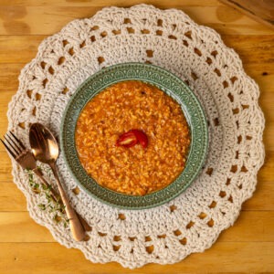 Experimente a harmonia perfeita da nossa carne assada suculenta, temperada com especiarias que realçam seu sabor, acompanhada por um risoto cremoso de tomates assados. Cada garfada é uma celebração de sabores que vai encantar seu paladar!