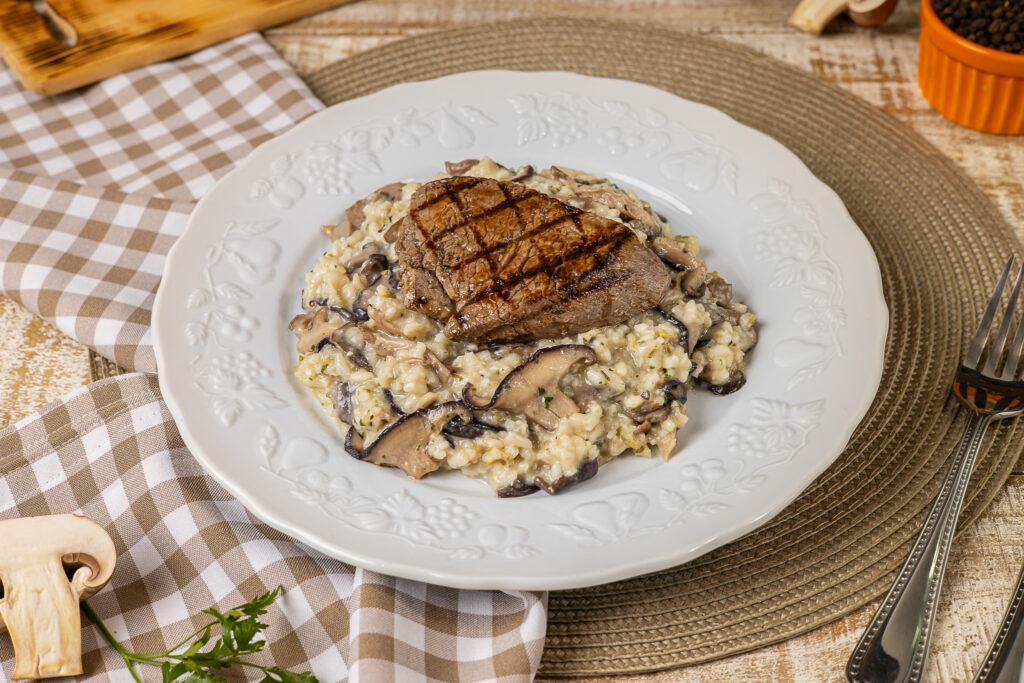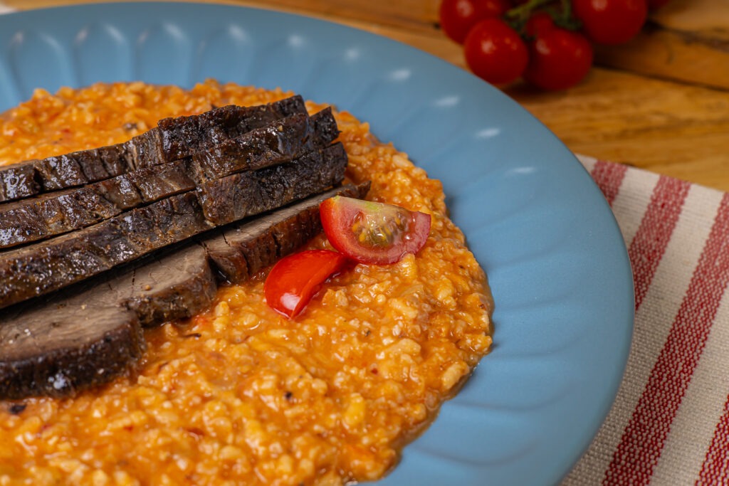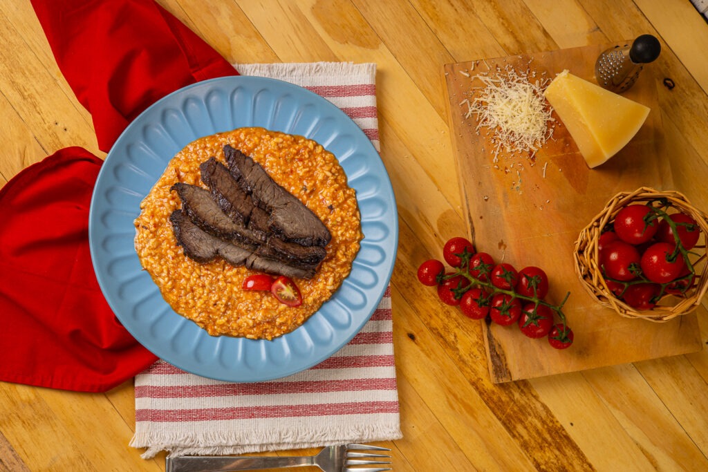 Risoto cremoso finalizado com pasta de tomates assados servidos com maminha assada lentamente.